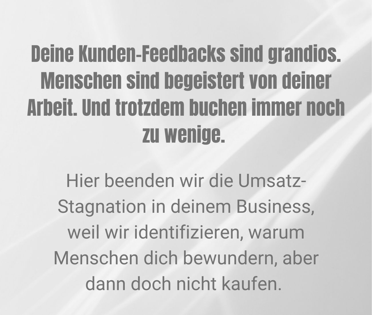 Ich stehe für Klarheit und kläre mit dir, warum dein Business trotz Sichtbarkeit, Erfahrung und Resonanz keine verlässlichen Kaufentscheidungen auslöst.